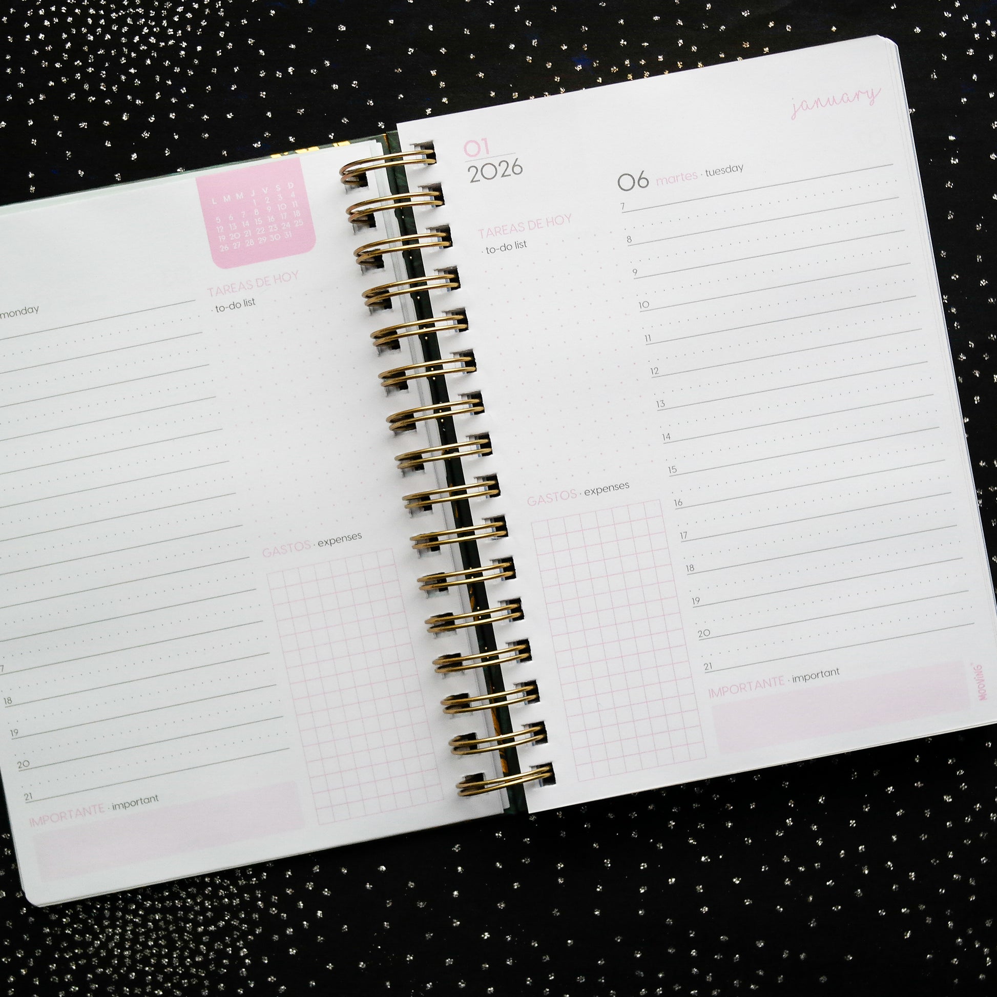 Planifica tu año con un toque elegante y natural. La Agenda Boho de Mooving combina practicidad con un diseño sofisticado lleno de detalles dorados que la hacen única.