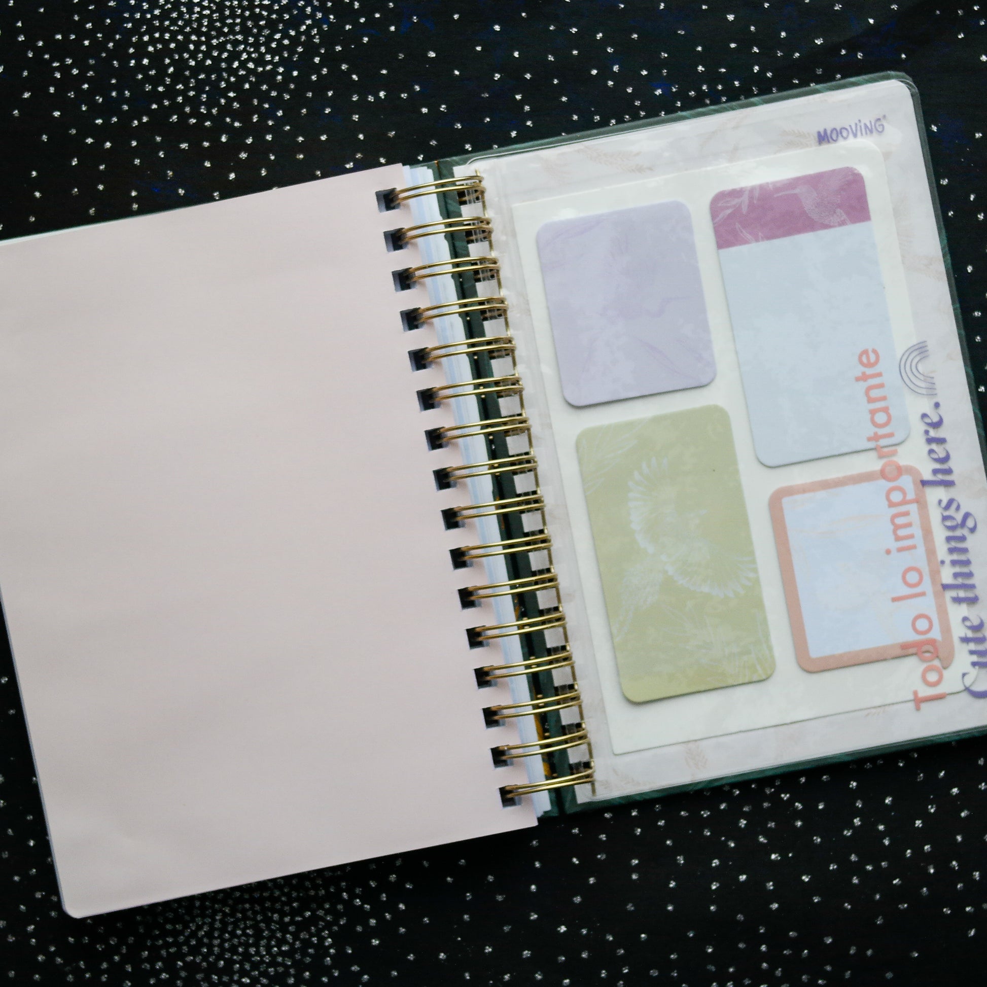 - Extras: 4 hojas para notas a color (sin rayado), 1 sobre plástico transparente y 1 hoja de notas adhesivas (4 diseños diferentes)