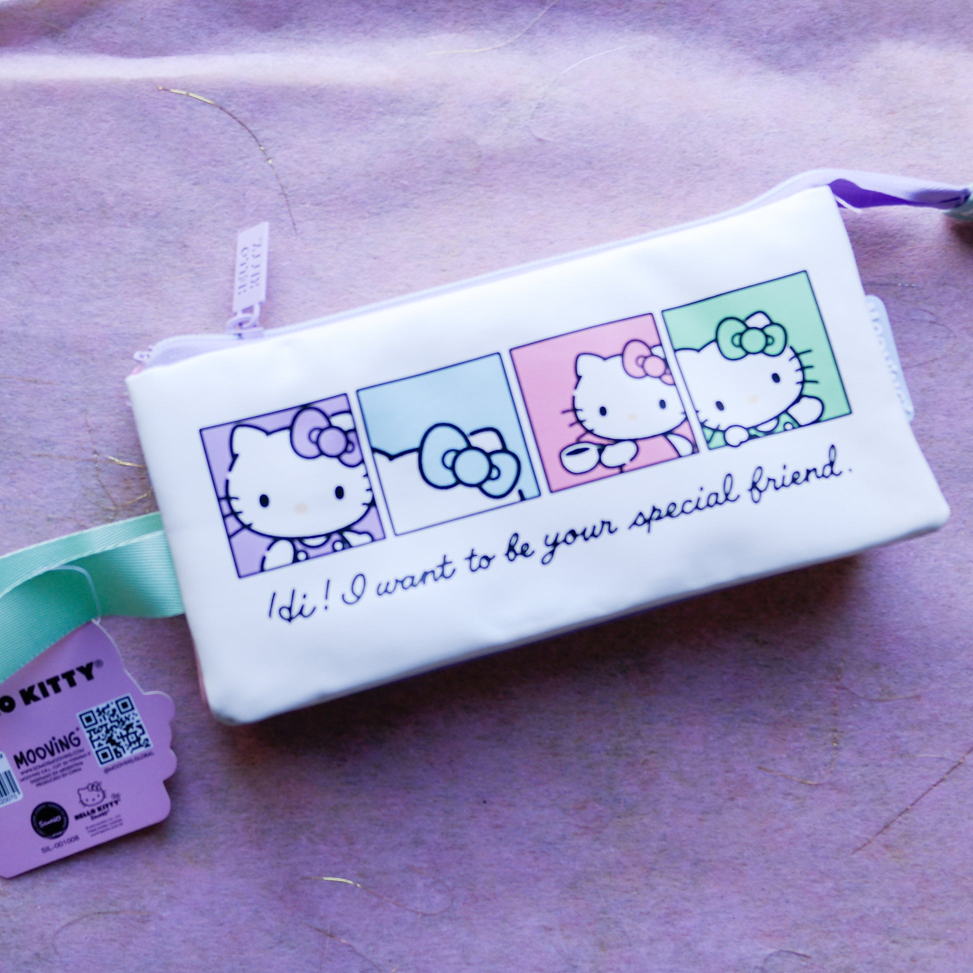 Este estuche en tono blanco perlado con el logo icónico y la carita de Kitty al frente es ideal para quienes aman lo tierno y minimalista. Su material suave y resistente lo convierte en el complemento perfecto para organizar lápices, maquillaje, cables o accesorios del día a día.
