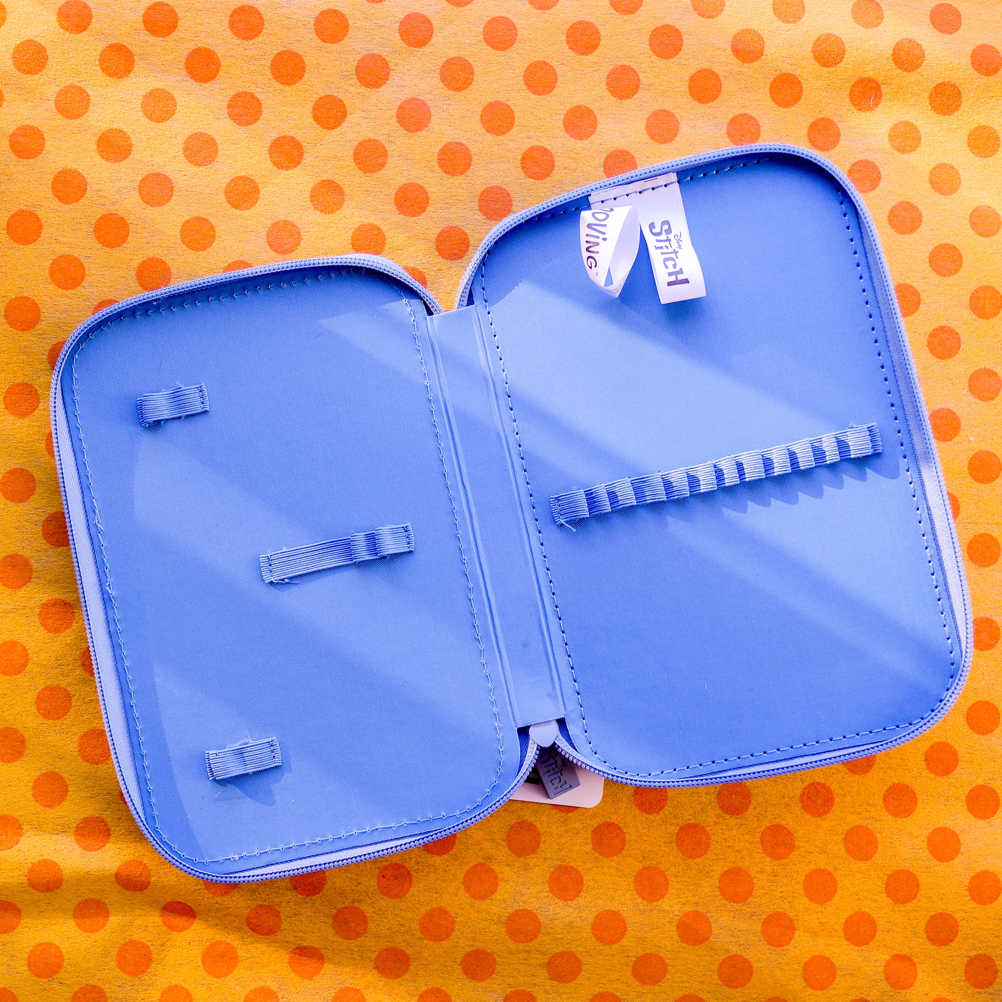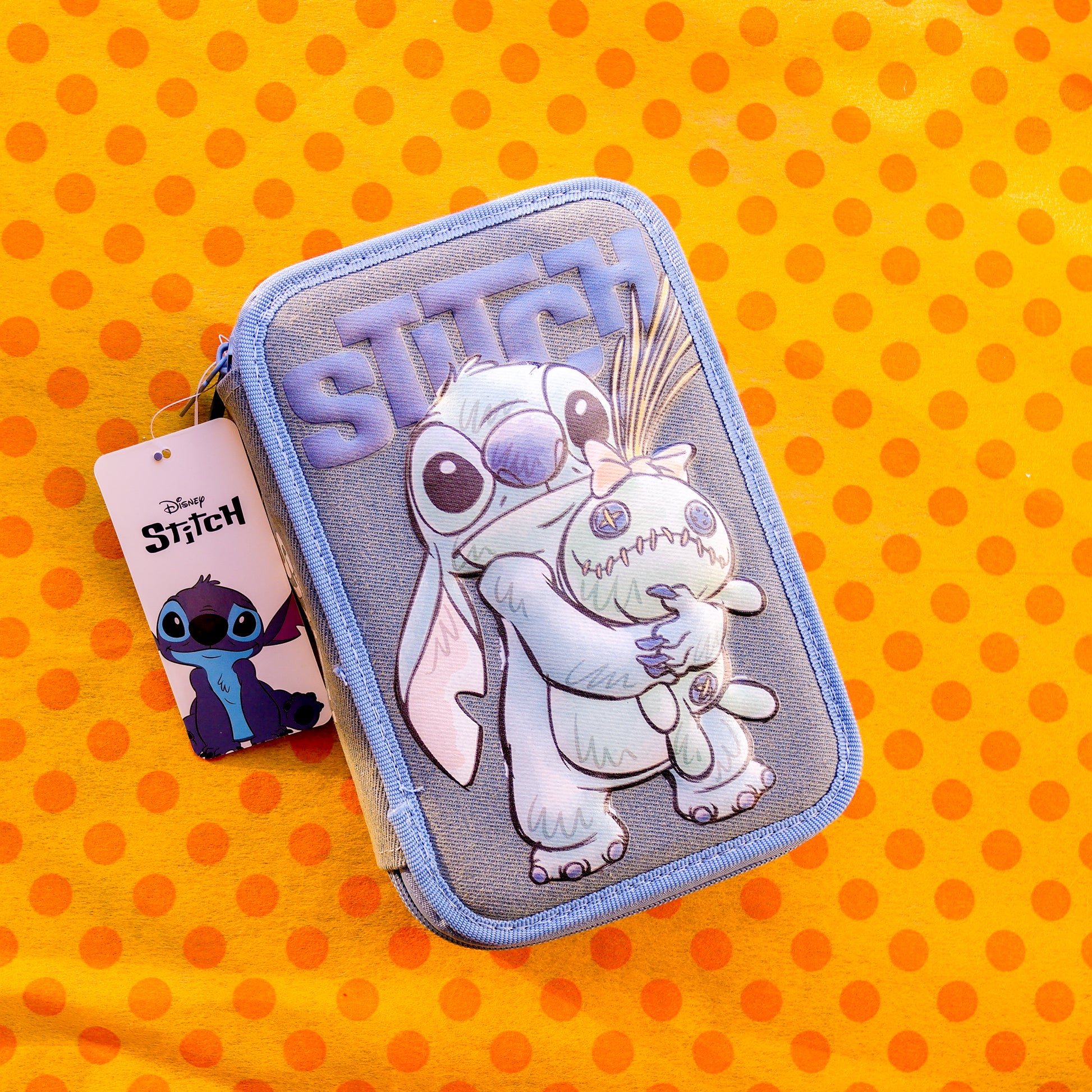 Este precioso estuche rígido de Stitch combina estilo, ternura y resistencia. Su diseño en tonos celestes muestra a Stitch abrazando a Trapos, con detalles bordados y relieve que lo hacen súper especial.