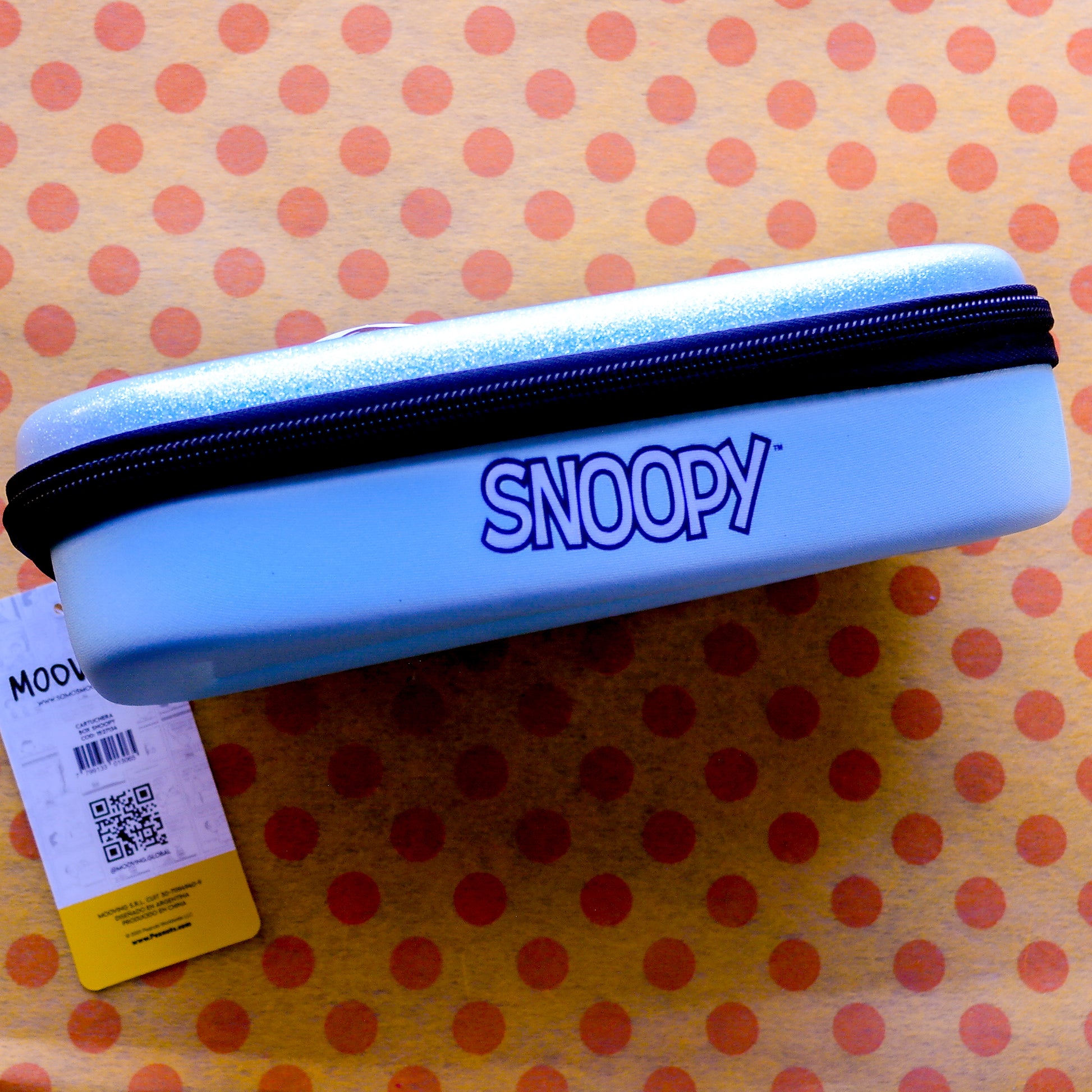 Este modelo presenta a Snoopy en relieve sobre un fondo celeste con brillo sutil, ideal para quienes aman la papelería bonita y los detalles únicos. Su estructura rígida protege perfectamente lápices, colores, maquillaje o accesorios.