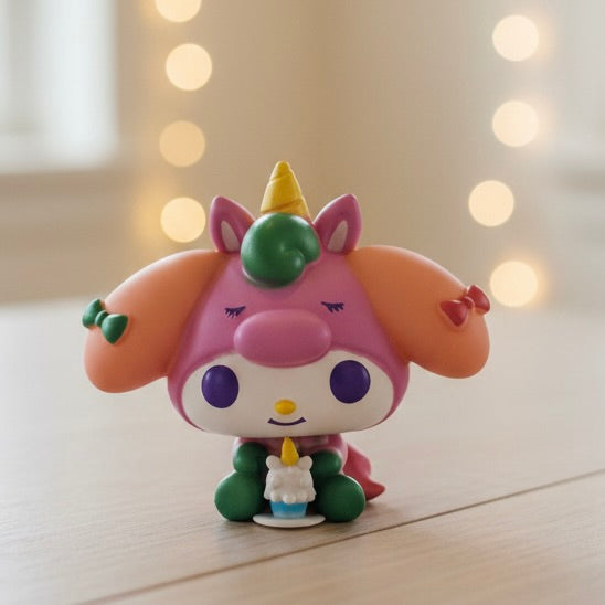 My Melody llega en una versión encantadora disfrazada de unicornio rosa, con moñitos en las orejas y un pequeño pastelito en sus manos.